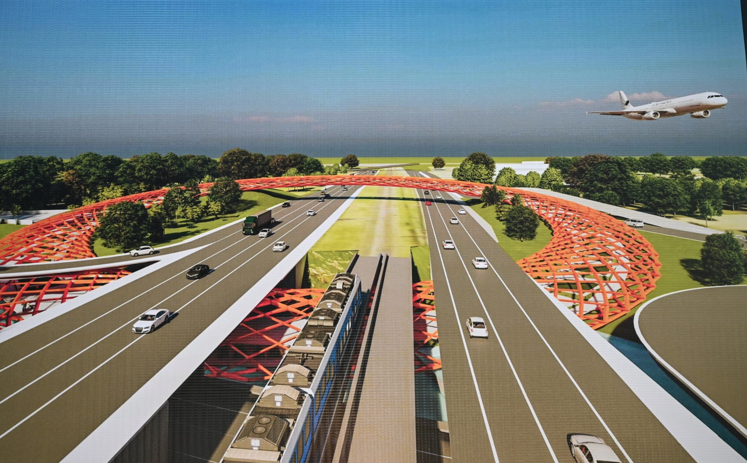 El Anillo La Pampa consiste en túnel y un puente con forma de anillo. Su diseño circular no solo es una declaración estética, sino que permite generar pendientes suaves y accesibles para peatones, corredores y ciclistas sin necesidad de escaleras abruptas. La estructura metálica, de un color naranja vibrante en los renders, aporta un contraste moderno con el verde del entorno.