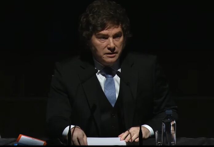 La aclaración de Milei generó risas y festejos entre los presentes, luego de que el diputado Adrián Ravier hiciera las presentaciones del debate “Keynes y la Teoría General” en el Palacio Libertad.