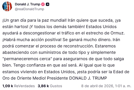 “El motivo es que ya hemos cumplido y superado todos los objetivos militares y estamos muy avanzados en la negociación de un Acuerdo definitivo sobre la PAZ a largo plazo con Irán y la PAZ en Oriente Medio. Recibimos una propuesta de 10 puntos de Irán y creemos que constituye una base viable para la negociación. Estados Unidos e Irán han acordado casi todos los puntos de controversia anteriores, pero dos semanas permitirán finalizar y concretar el Acuerdo. En nombre de los Estados Unidos de América, como Presidente, y también en representación de los países de Oriente Medio, es un honor que este problema de larga data esté cerca de resolverse. ¡Gracias por su atención a este asunto!“, sostuvo.
