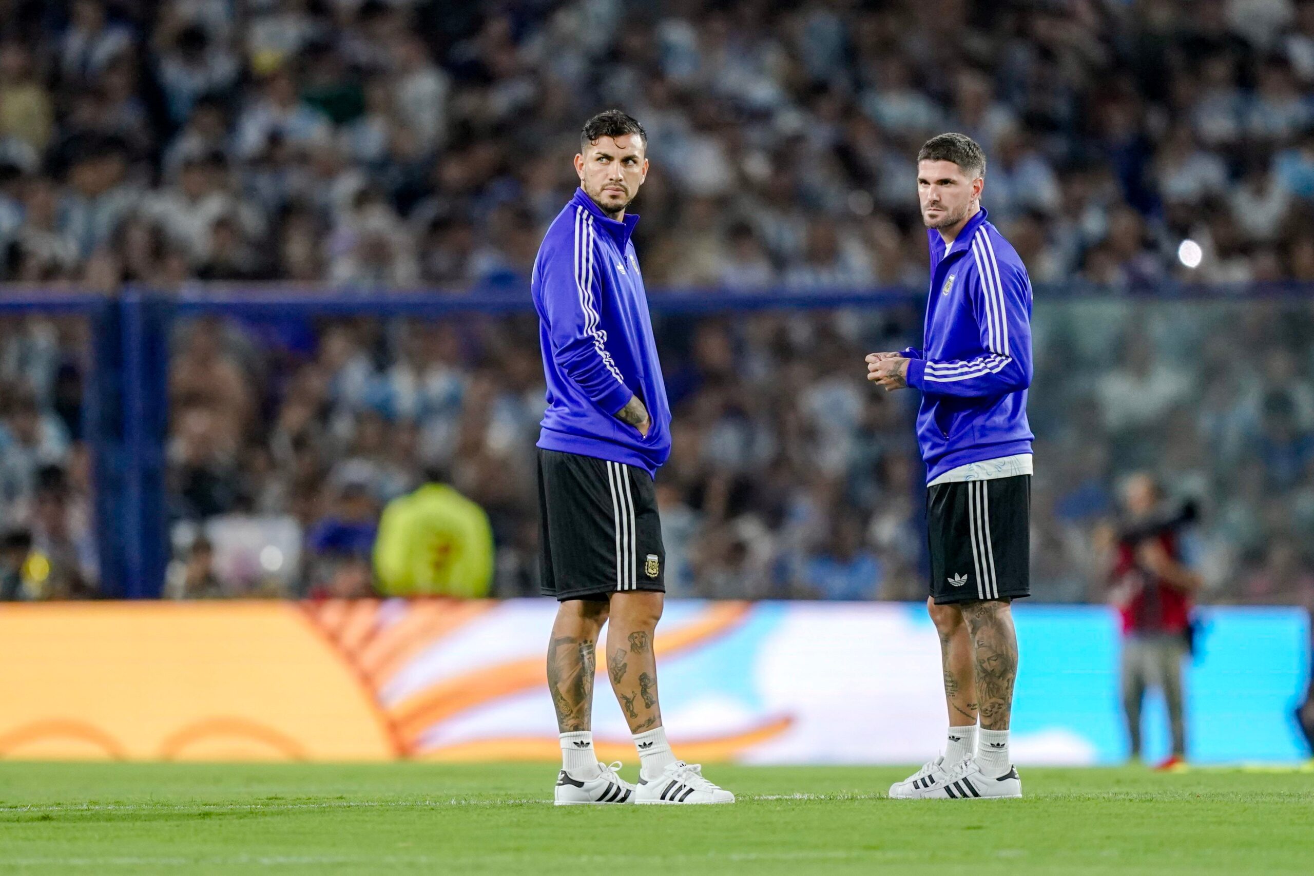 Leandro Paredes y Rodrigo De Paul salieron al campo de juego previo al calentamiento para hacer el ritual habitual de comer los caramelos. Aplausos para los dos y cánticos para el 5 de Boca.