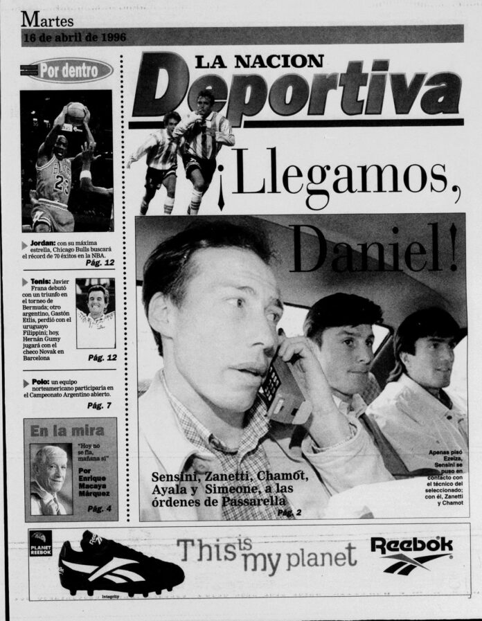 Hace apenas 48 horas se cumplieron 30 años de aquel momento. Eran tiempos de eliminatorias para el Mundial Francia 98, ese de los penales con Inglaterra. La primera tapa fue una imagen de la llegada de los jugadores desde Europa y allí aparecen Roberto “Boquita” Sensini, Javier “Pupi” Zanetti y José Chamot.